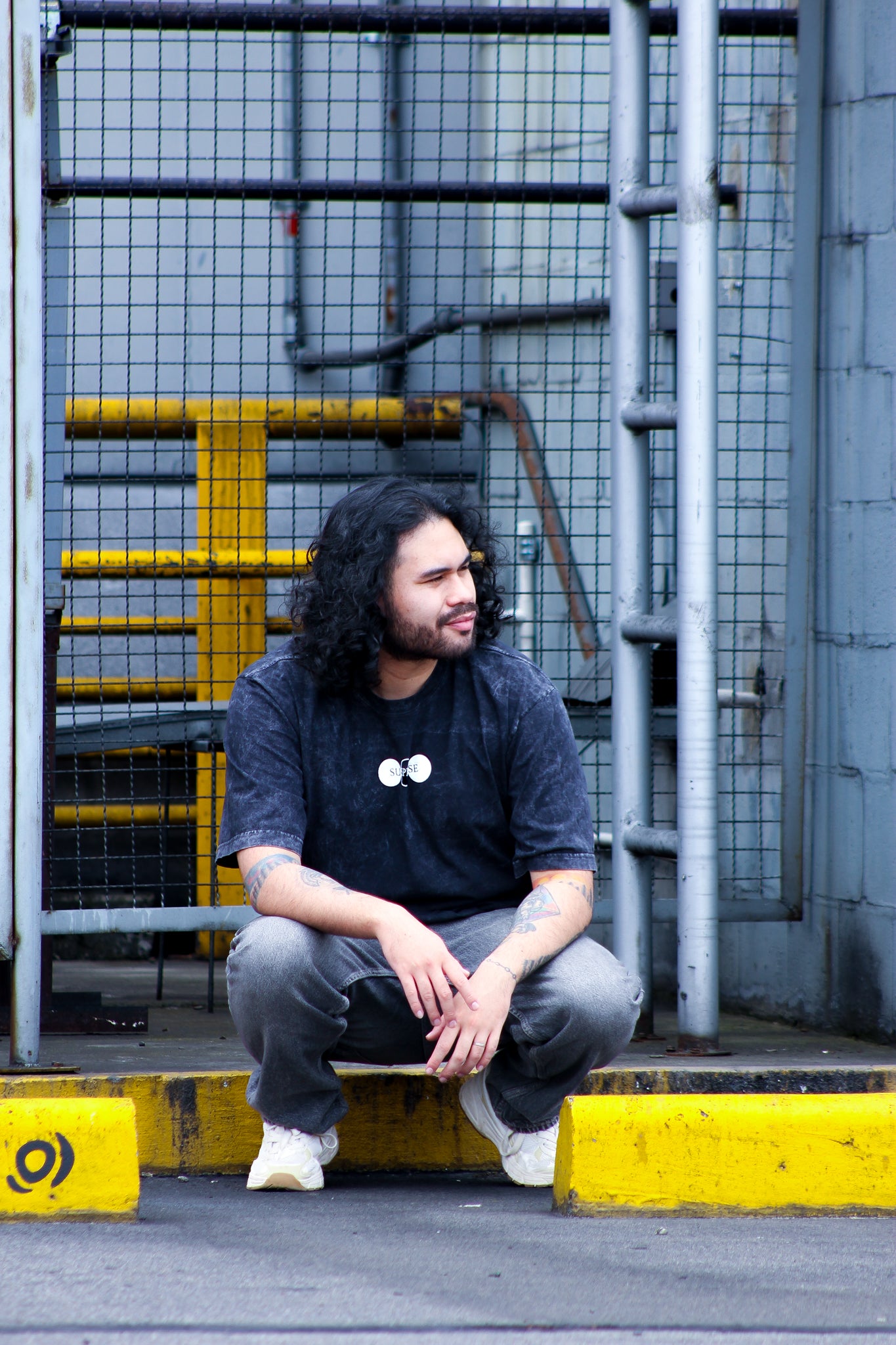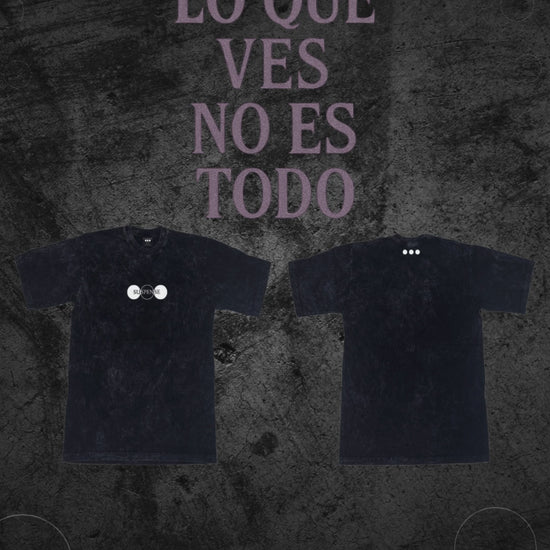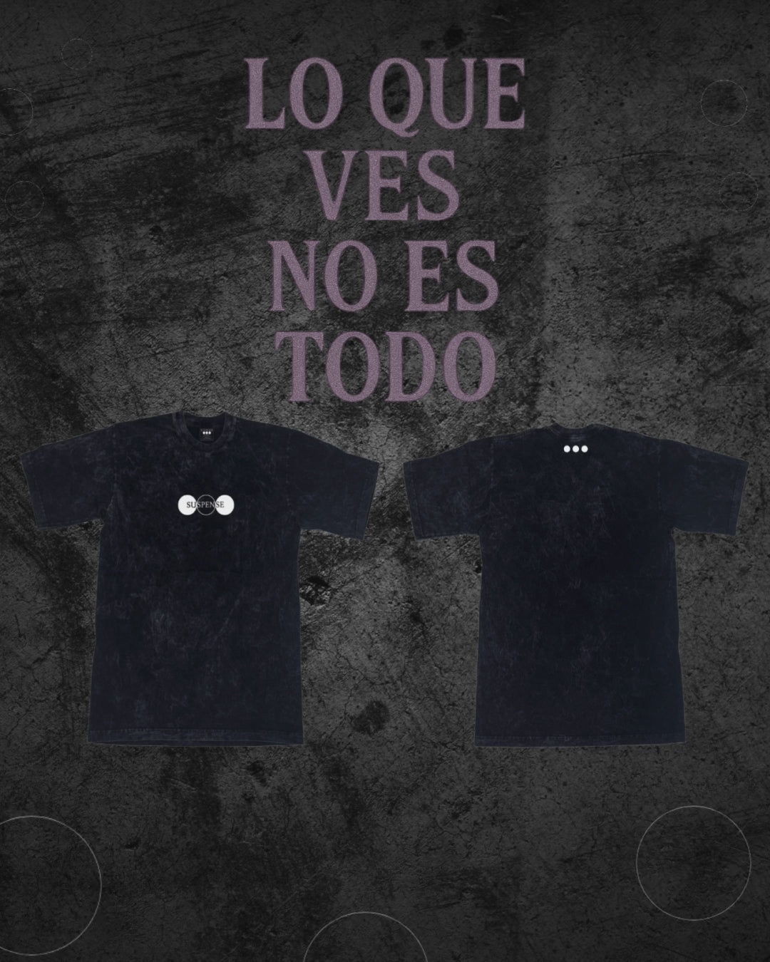 negra grafito con acid wash, fit amplio y hombro caído. Al frente, el arte de círculos SUSPENSE y los tres círculos, basica... lo que ves no es todo