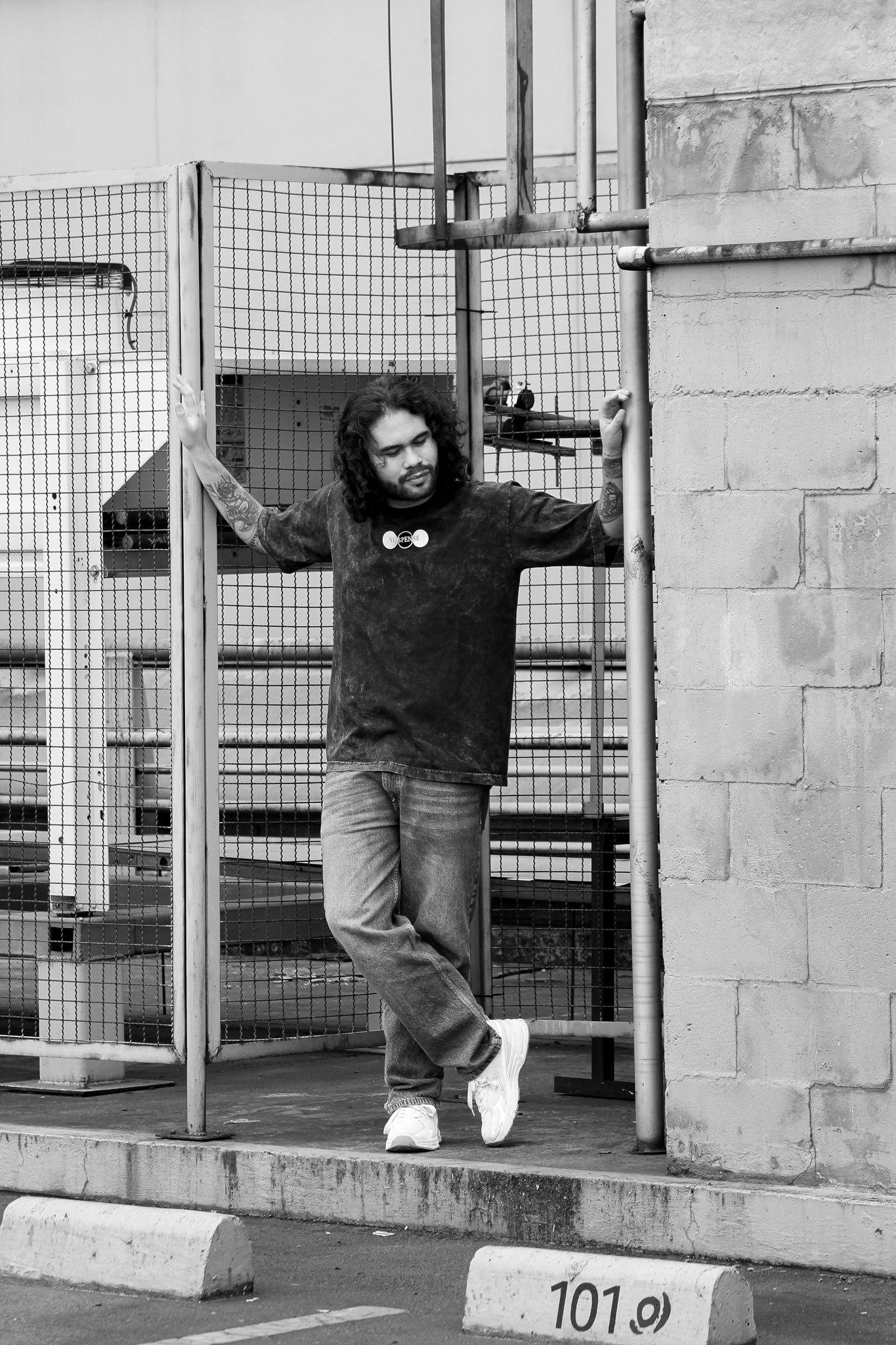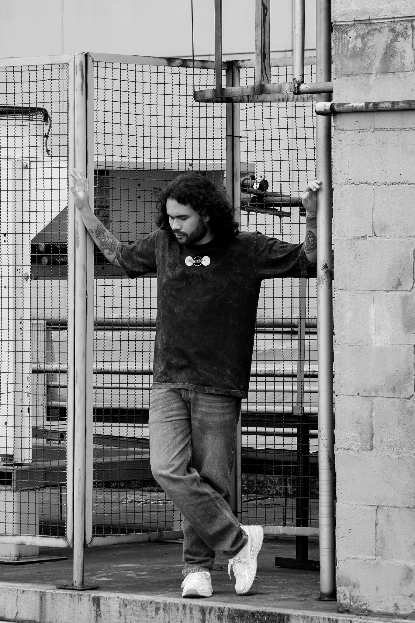 negra grafito con acid wash, fit amplio y hombro caído. Al frente, el arte de círculos SUSPENSE. Etiqueta la primera