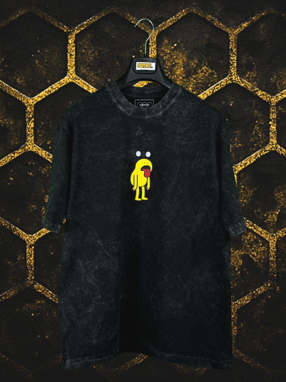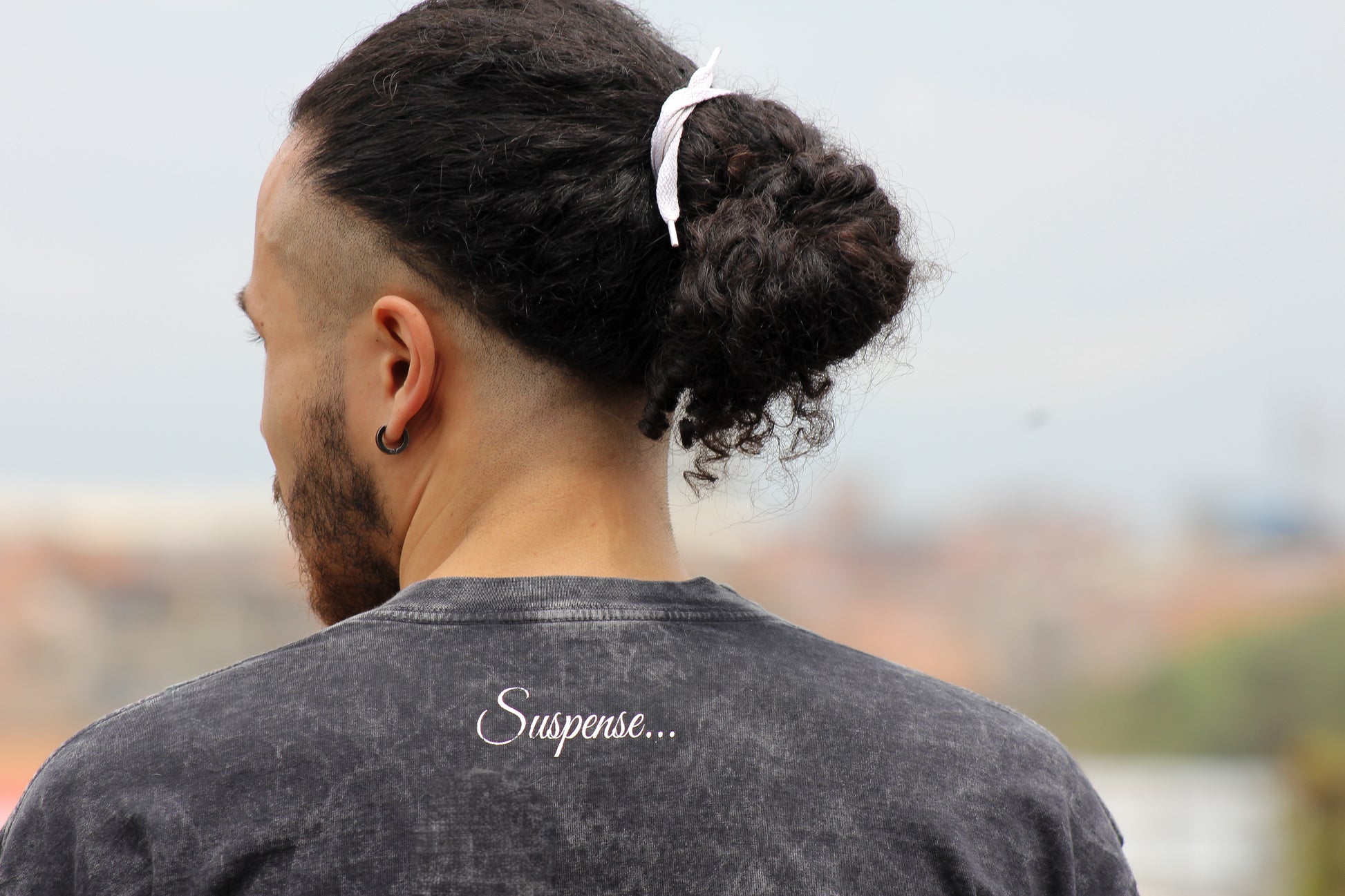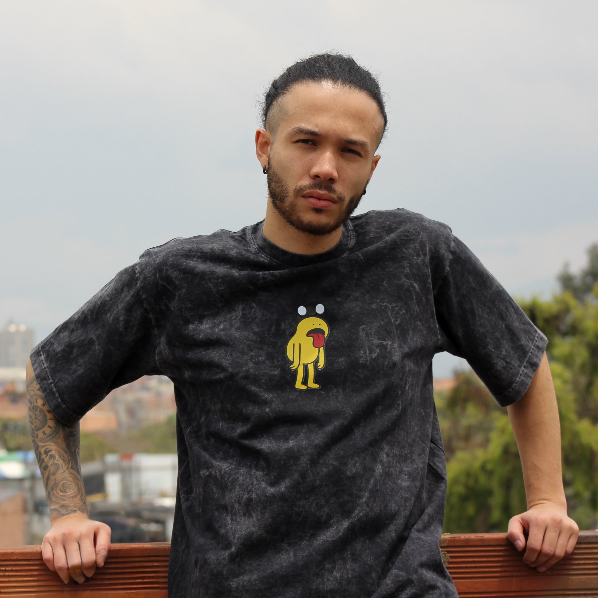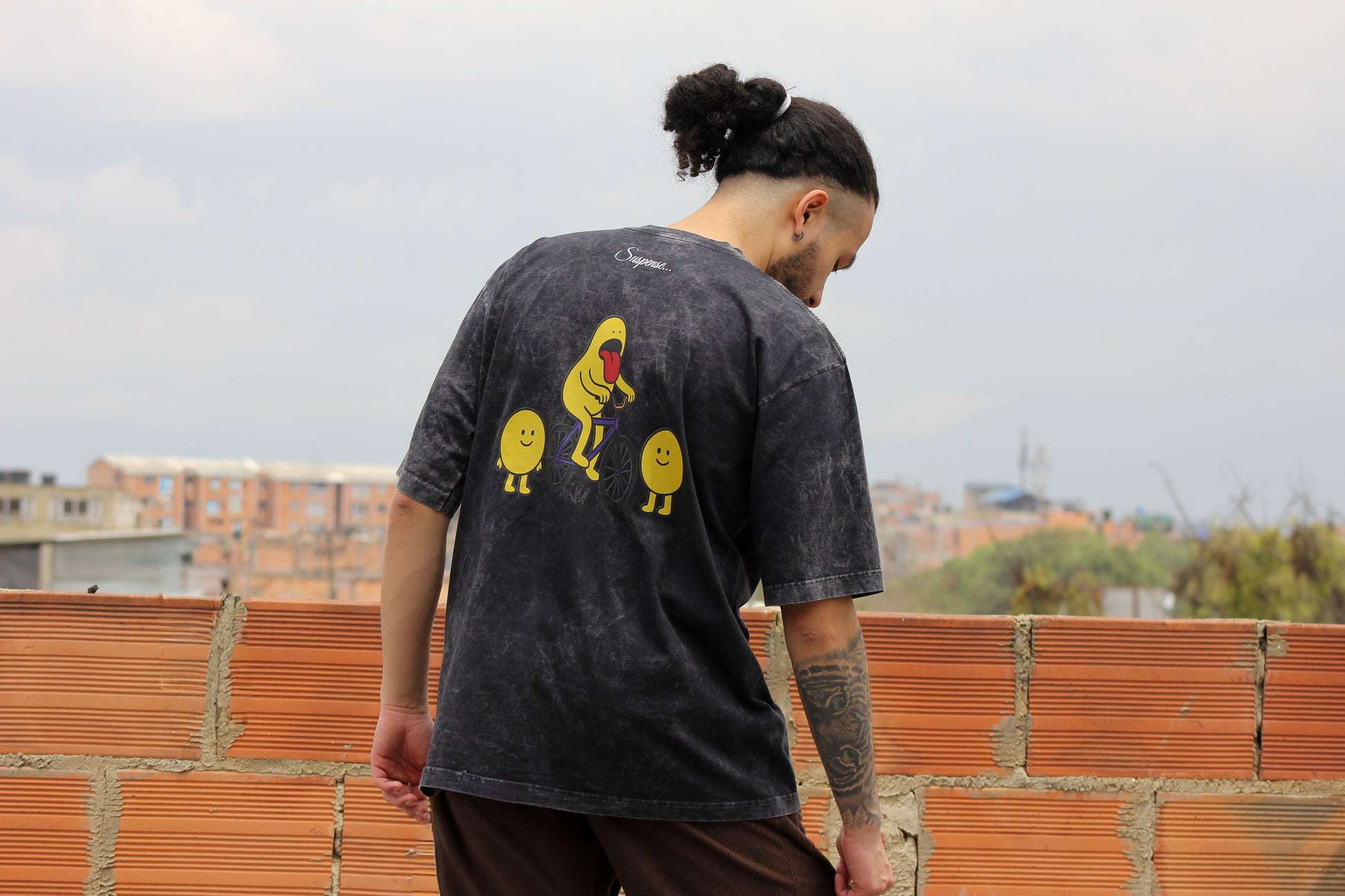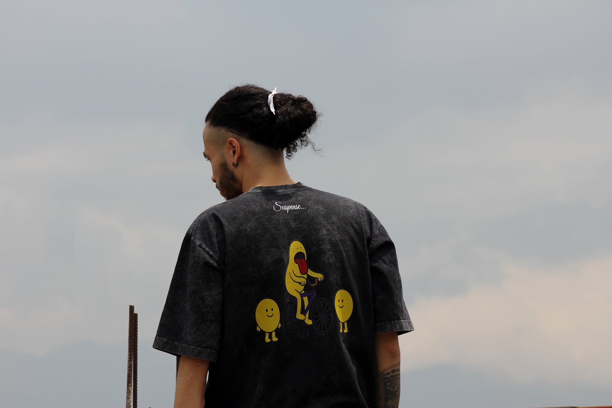 En la espalda está la escena completa: Popu pedalea su nueva bici—un poco torpe, pero feliz—mientras dos caritas lo escoltan como si fueran sus panas de rodada. Arriba, en la nuca, “Suspense…”: ese susurro que queda cuando algo está por pasar.